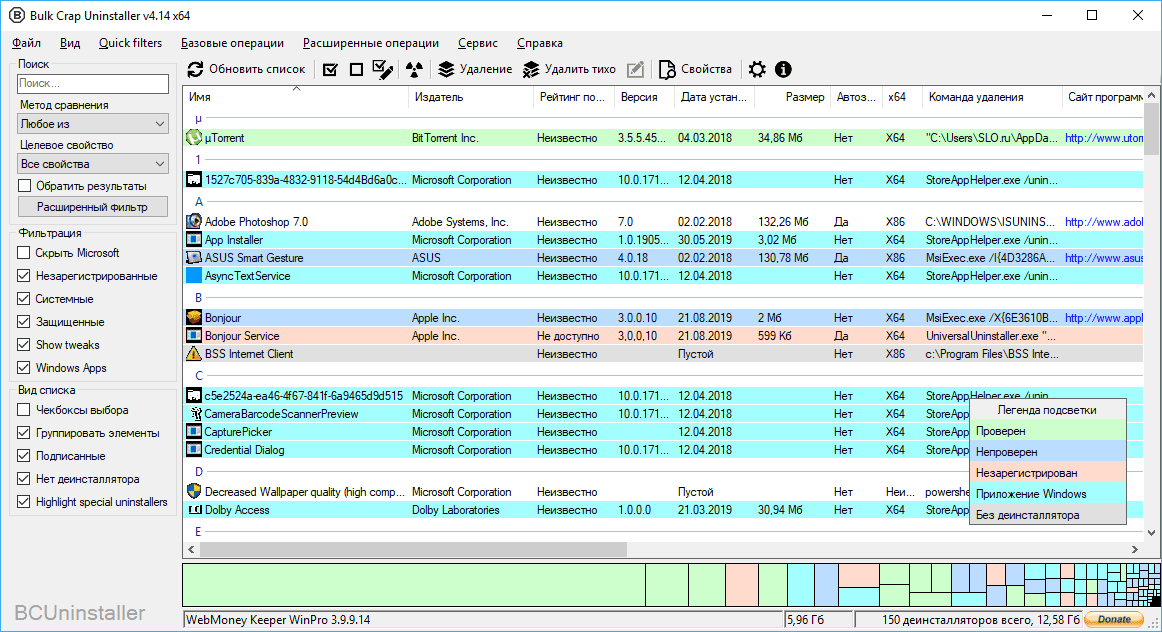 У Bulk Crap Uninstaller мощная система фильтрации установленных программ с сортировкой по типам или с использованием ряда параметров; графическая карта, наглядно отображает объем жесткого диска, занимаемый тот или иной программой; функция управления автозапуском; поиска выбранной программы по профильным сайтам; система рейтинга; очистка пустых папок в директории Program Files и многое другое.